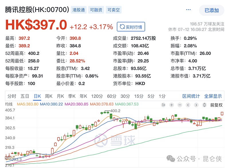 腾讯今年至今股价上涨了 36%,表现不俗,上周五收盘价 397 元,迫近今年 5 月 17 日的高点 400 元,估计有不少朋友根据 K 线走势也会动了 “止盈” 的想法。