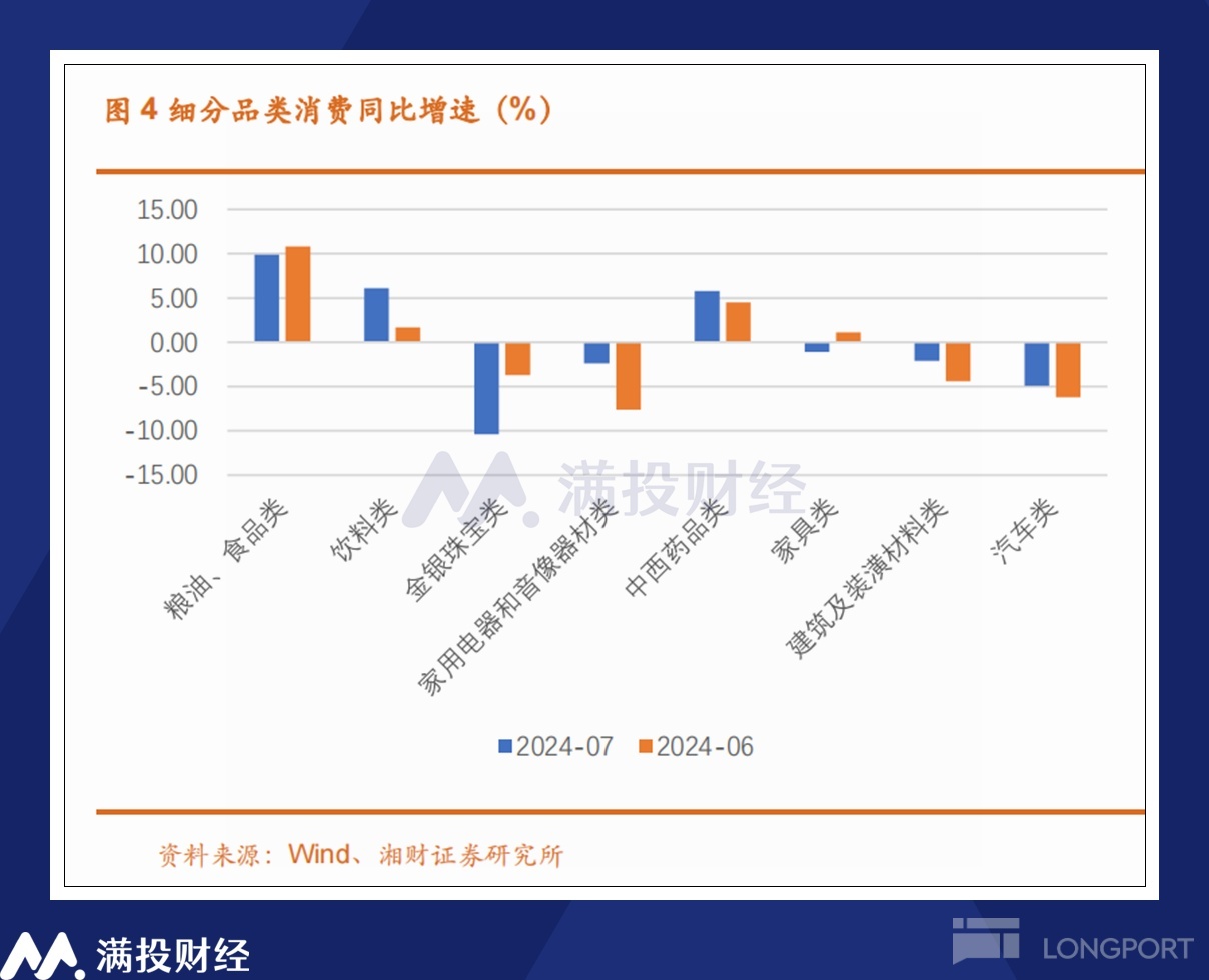 从 6-7 月份的消费数据来看,刚需类的消费依旧维持韧性,基本生活类商品的零售数据军白较好的增长趋势,类似食品粮油、饮料、中西药品类产品依旧能够维持增长;耐用品和地产链方面的消费则比较弱,金银珠宝同比增速为-10.4%,音像器材类同比增速为-2.4%,建筑及装潢材料同比增速为-2.1%。