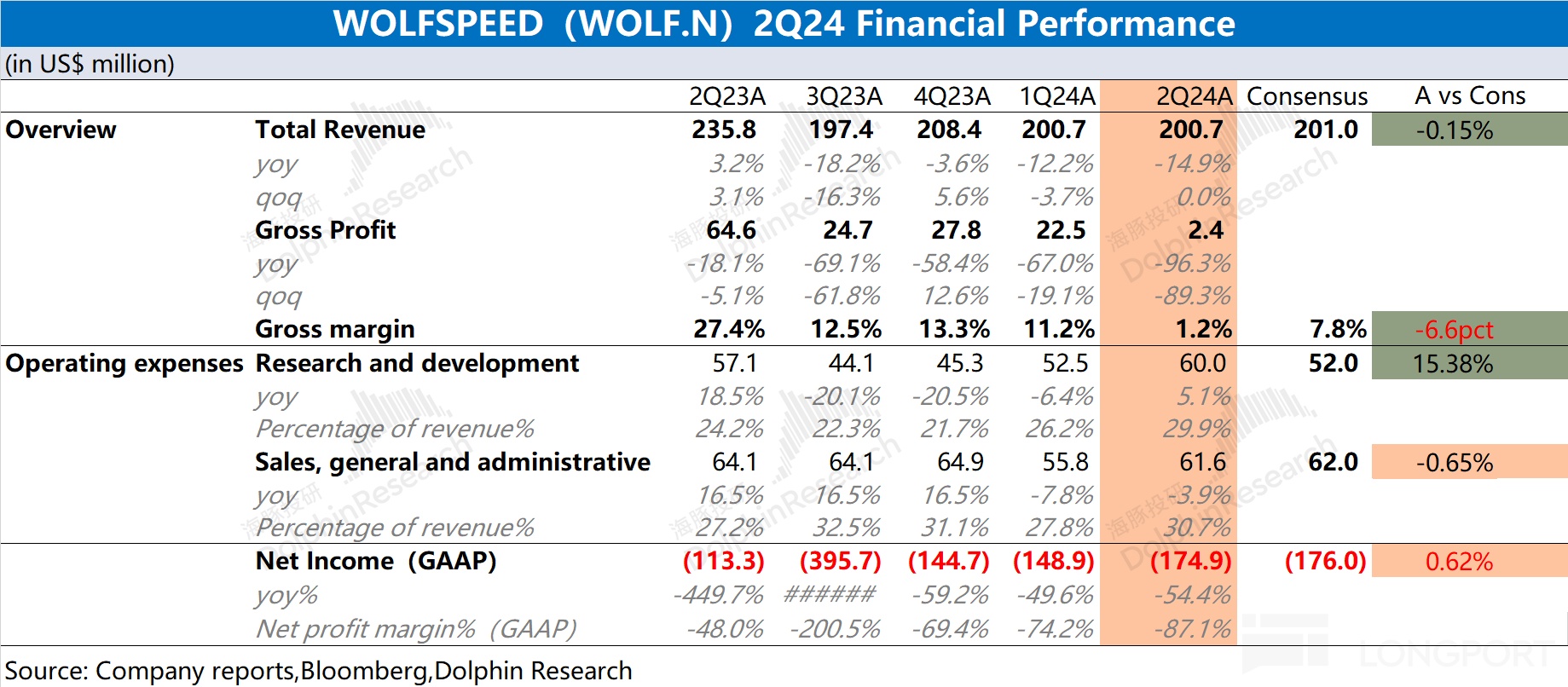 4、净利润:Wolfspeed 在 2024 财年第四季度(即 24Q2)的净利润(GAAP)净亏损再次扩大至 1.75 亿美元,接近于市场预期(-1.76 亿)。公司本季度利润端的下滑,主要是毛利率骤降的影响,新工厂利用率不足进一步扩大了亏损。