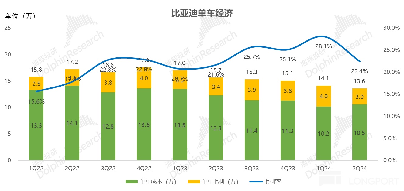3) 单车毛利:单车价格环比下滑 0.5 万元,单车成本环比上升 0.4 万元,最后二季度卖一辆车比亚迪毛赚仅 3 万元,整体卖车(含电池业务)的毛利率从上季度 28.1% 下行到本季度仅 22.4%。
