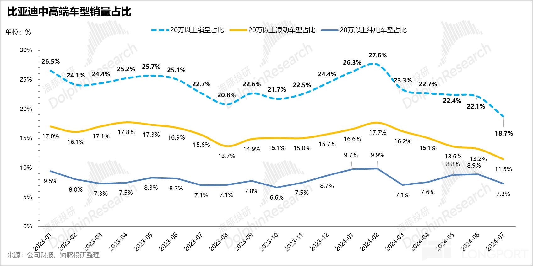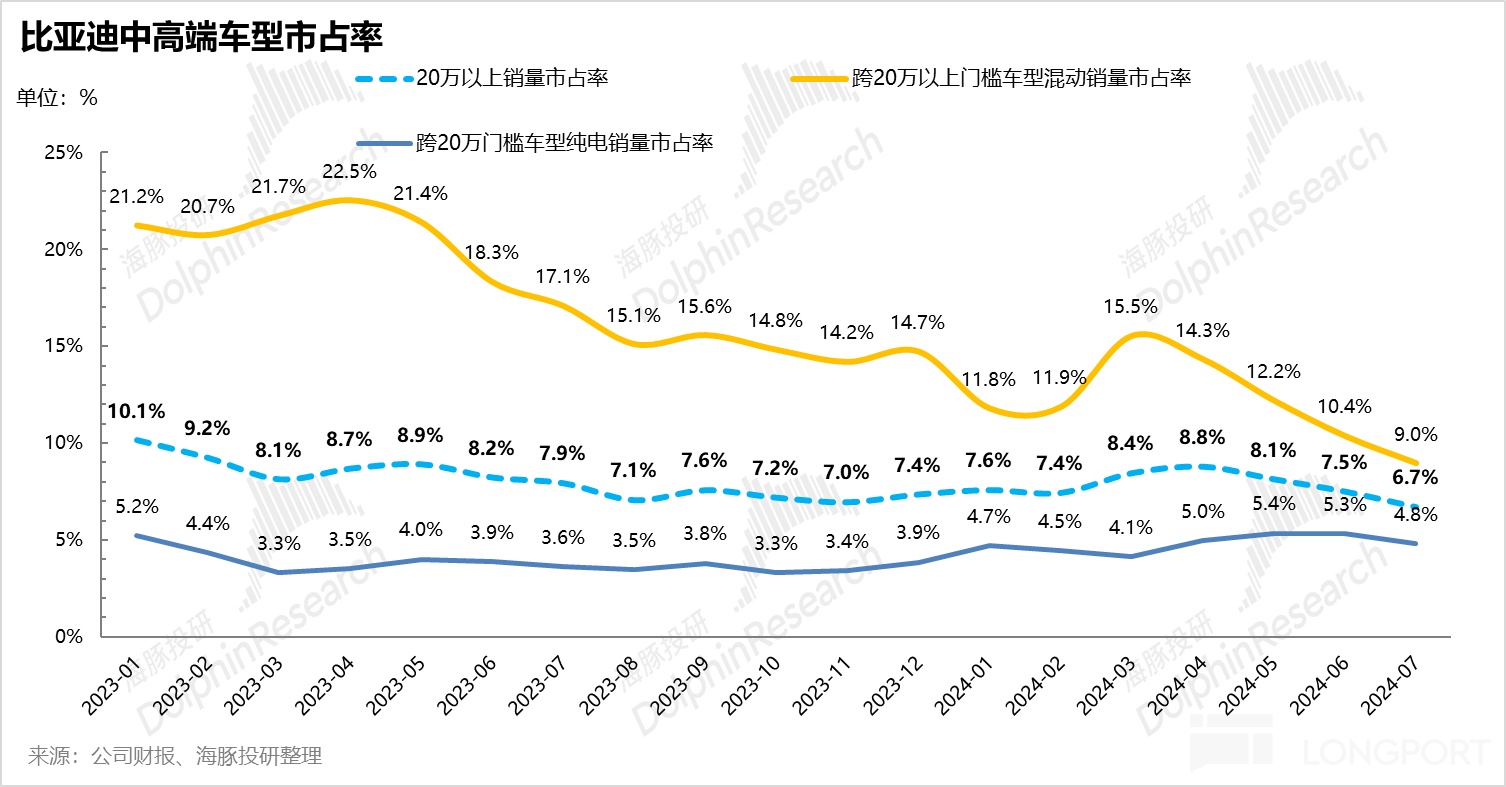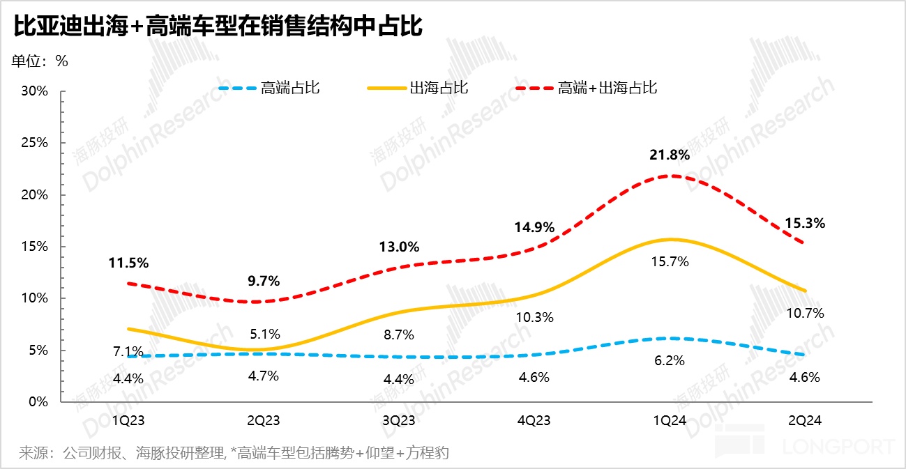5. 出海和高端化业务本季度表现都很疲软:高端化表现疲软海豚君一方面认为是新品节奏问题,但另一方面来自于竞争加大,混动中高端市场份额被问界和华为双雄抢占,出海放缓问题预计下半年可以加速。