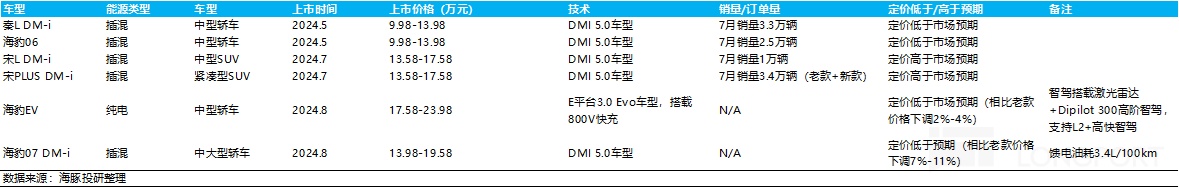 1. 降价:比亚迪对旗下方程豹豹 5 价格下调 5 万元,与坦克 300 Hi4-T 直接展开竞争;比亚迪上新的基于 DMI 5.0 的海豹 07 相比老款价格下调 7%-11%,低于市场预期。