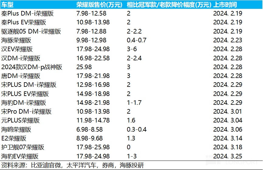 c) 荣耀版车型于 2 月开始陆续上市,价格相比冠军版指导价进一步下探,影响全部计入二季度:比亚迪荣耀版上市相比 23 款冠军版指导价普遍低 1-3 万元,将比亚迪插混车型的主力价格带从原先 10-20 万元将至 8-15 万元。