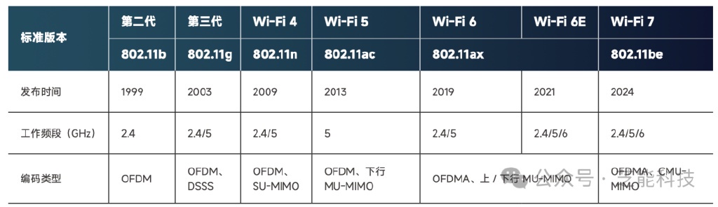 Wi-Fi 技术已经历了多个版本的演进,其工作频段从 2.4GHz 扩展至 5GHz 和 6GHz,通过提升信道宽度、工作流数和单符号携带数据量,Wi-Fi 6 的理论传输速率已达到 9.6Gbps。