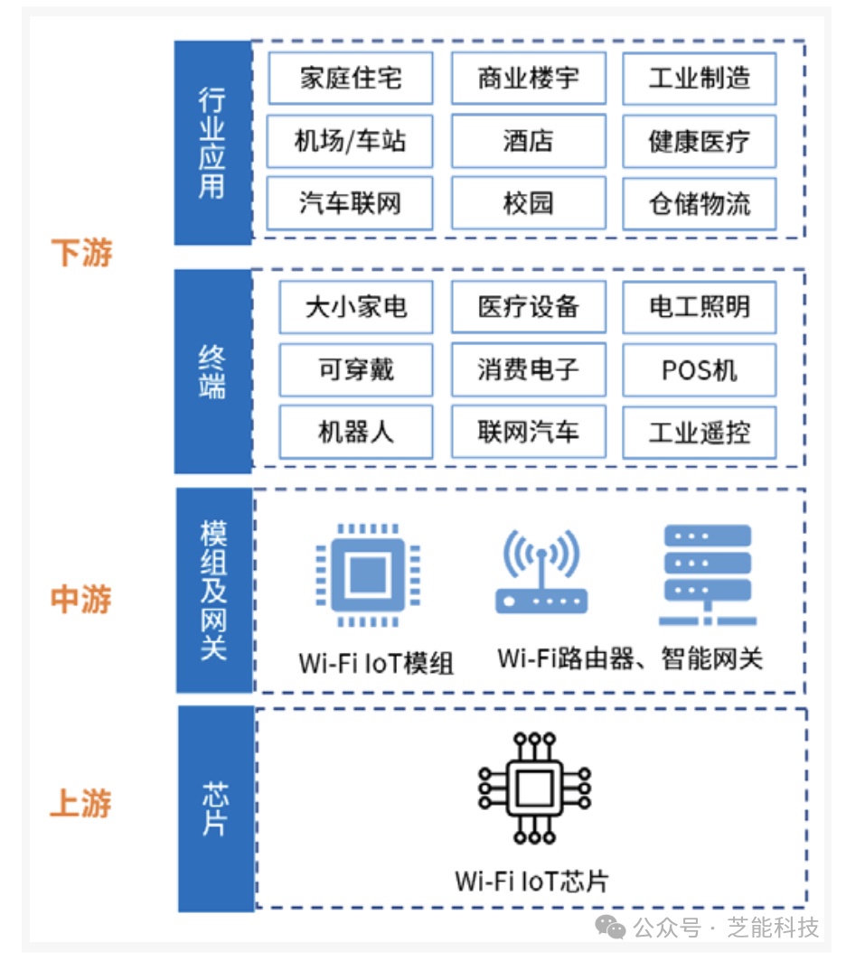 Wi-Fi 产业链涵盖上游芯片、中游模组与路由器及下游应用场景。