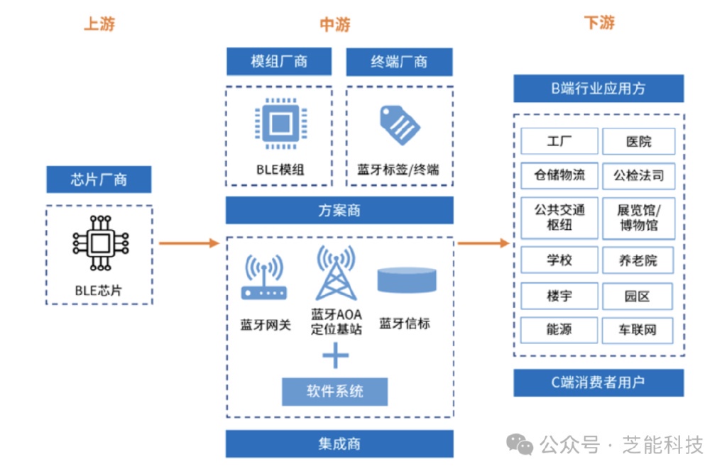 蓝牙产业链包括上游 BLE 芯片、中游蓝牙模组与定位解决方案以及下游消费级、工商业级和汽车级市场。各级市场对蓝牙技术的需求各有侧重,芯片厂商需在协议支持、功耗和安全性等方面不断优化。