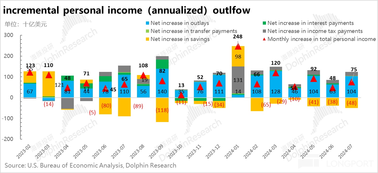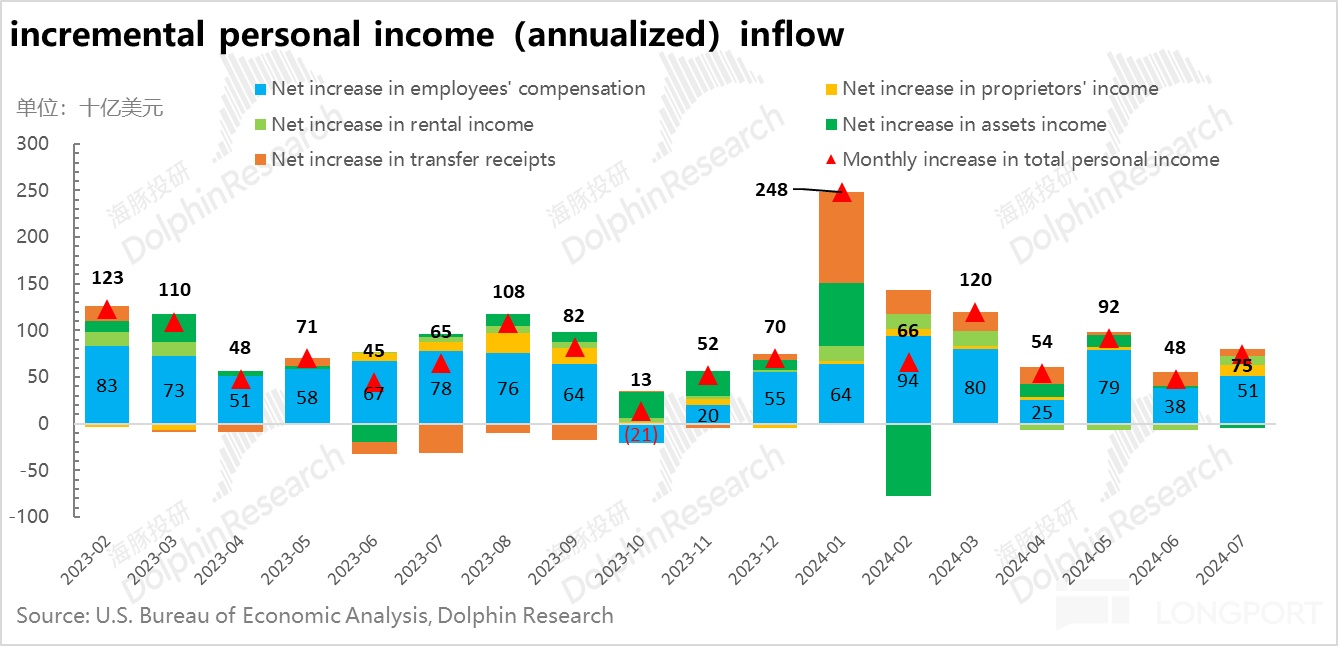 a. 7 月美国居民群体月薪资收入的年化新增是 510 亿美元,月收入折年数的环比是 0.31%,相当于接近 4% 的同比增长。因此,无论是新增绝对值还是同比来看,居民总收入池子是在无功无过,整体稳健的状态。
