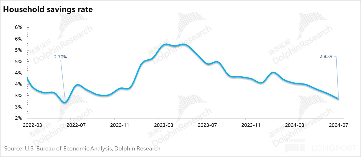 在居民收入并没有大幅增长的情况下,消费持续挤压居民储蓄率,结果就是到了 7 月,储蓄率几乎创下了 2022 年直升机撒钱之后的新低,只有 2.85% 了。也就是说,美国居民每挣 100 块钱的可支配收入,只有 2.85 元转为储蓄了(类似企业的净利润,无论是这个储蓄是存款还是投资)。