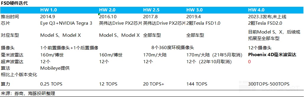 特斯拉在自动驾驶中不断迭代,软件端的迭代可以通过远程 OTA 完成,但硬件端的迭代无法后期更改,目前 FSD 已经迭代到 HW4.0,提升最大的是 FSD 的芯片算力,从 HW3.0 提升到 HW4.0 约 500 Tops, 而 HW5.0 也即将在 2025 年推出,预计算力将相比 HW4.0 提升 10 倍,提升到 5000 Tops, 而 Robotaxi 基于 L4 的自动驾驶可能对于硬件端,尤其芯片算力要求会更高,而海豚君关注的问题在于是否所有的存量特斯拉车型都可以加入 Robotaxi? 还是至少基于 HW4.0 硬件版本的车型?