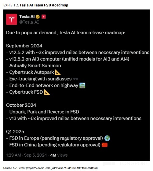 2)车端硬件 + 软件端算法领先:FSD V12 端到端算法领先国内玩家近 2 年;硬件端 HW 5.0 即将在 2025 年 12 月推出,性能是 HW 4.0 的 10 倍,约 5000TOPS+;