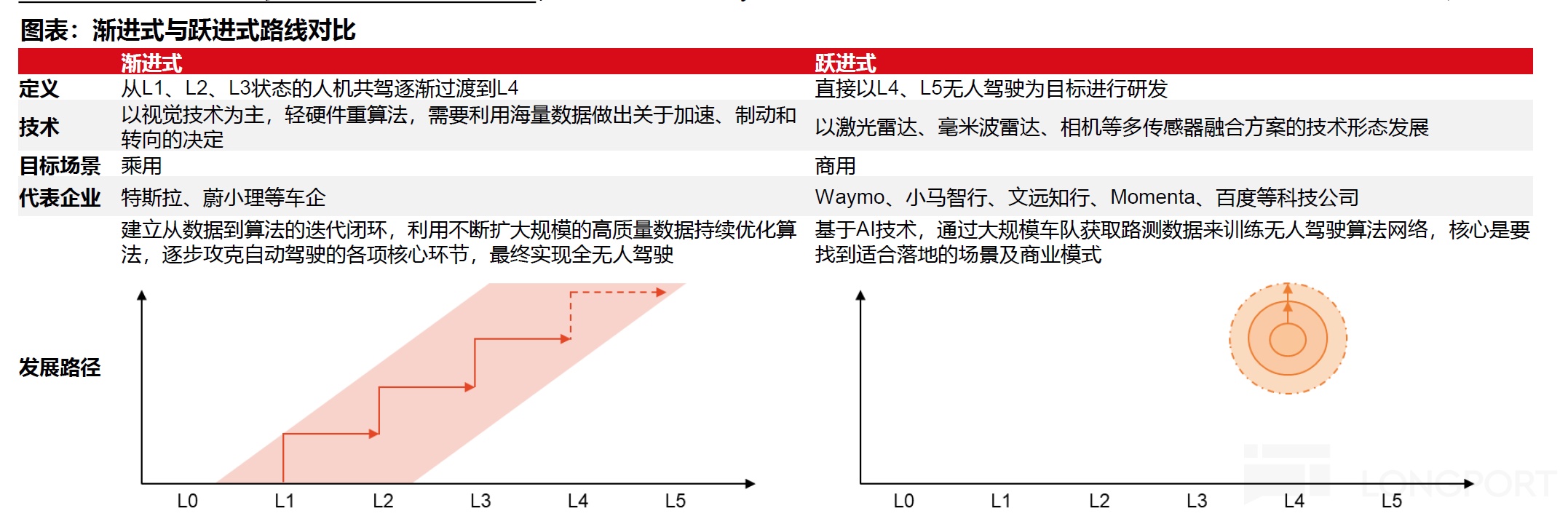 但 L4 级别的自动驾驶是 Robotaxi 能提供服务的一个先决条件,以特斯拉为首的渐进式路线车企(从 L1 逐渐向 L4 过渡),基本都在路线上转向大模型 + 纯视觉方案(包括蔚小理等),但目前提供的自动驾驶服务仍然是 L2+ 级别,而目前已经落地的无人驾驶提供商都采用的是跃进式路线(直接以 L4 为起点),且都采用是多传感器方案,跃进式路线相比渐进式路线目前看来在技术层面落地速度更快。
