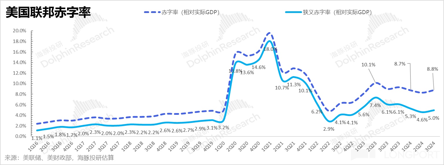 由于联邦支出中,头号多增的支出是利息支出,而利息支出主要是对存量债务的付息,不构成投入经济的实物工作量,所以海豚君选取剔利息支付后的狭义赤字率来做重点观察,可以看到,2024 年前三个季度岁虽然狭义赤字率相比 2023 年有所收敛,但相比疫情前 1-3% 之间的赤字率,仍然是财政高刺激状态。