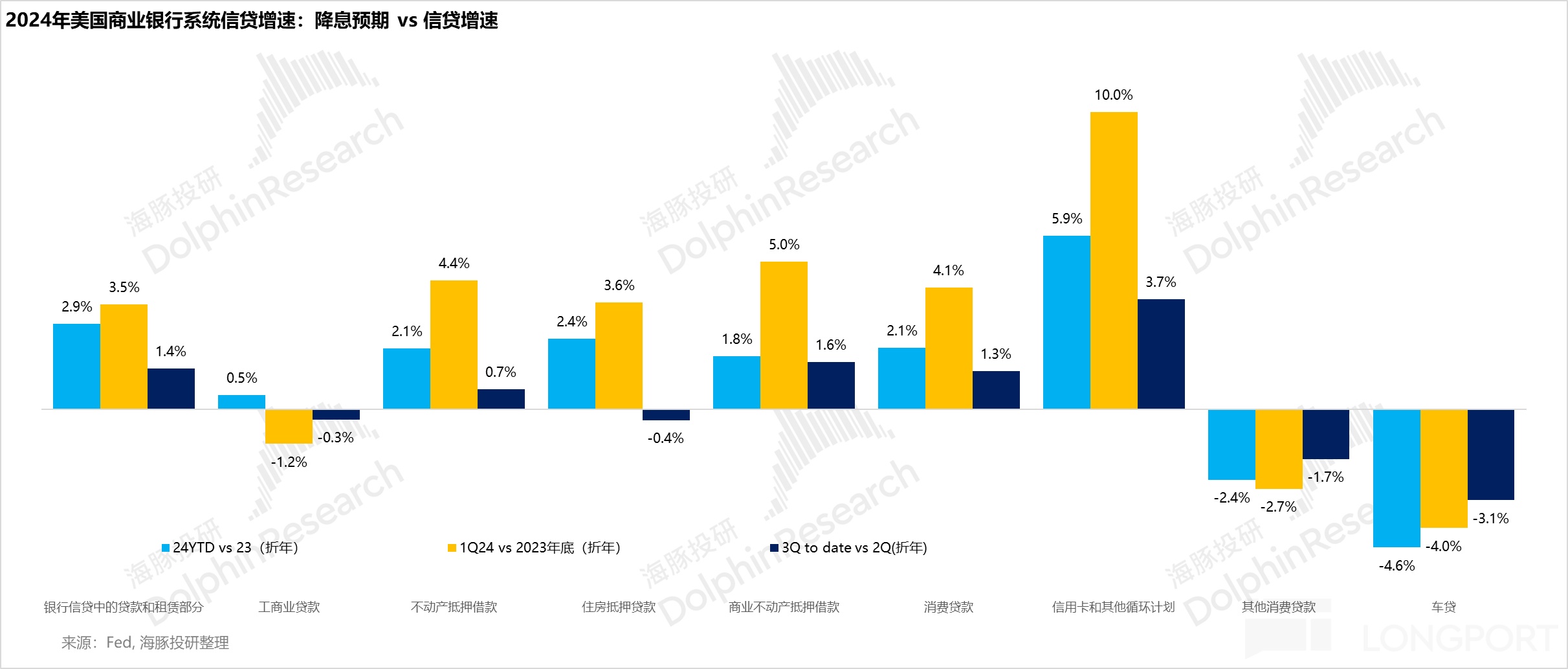 这正如海豚君之前所言,由于这轮加息之前居民实际获取的利率太低,这次降息的 50 个基点根本不至于刺激居民去加杠杆,此次降息更偏预防性降息。而假如经济确实较弱,确实需要把信贷需求增速从目前的 1-2%,刺激到疫情前 19 年接近 6% 的增长,那么实际的降息幅度和速度远远不止当下美联储引导的速度。
