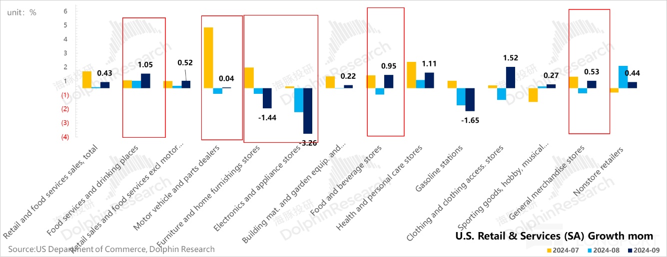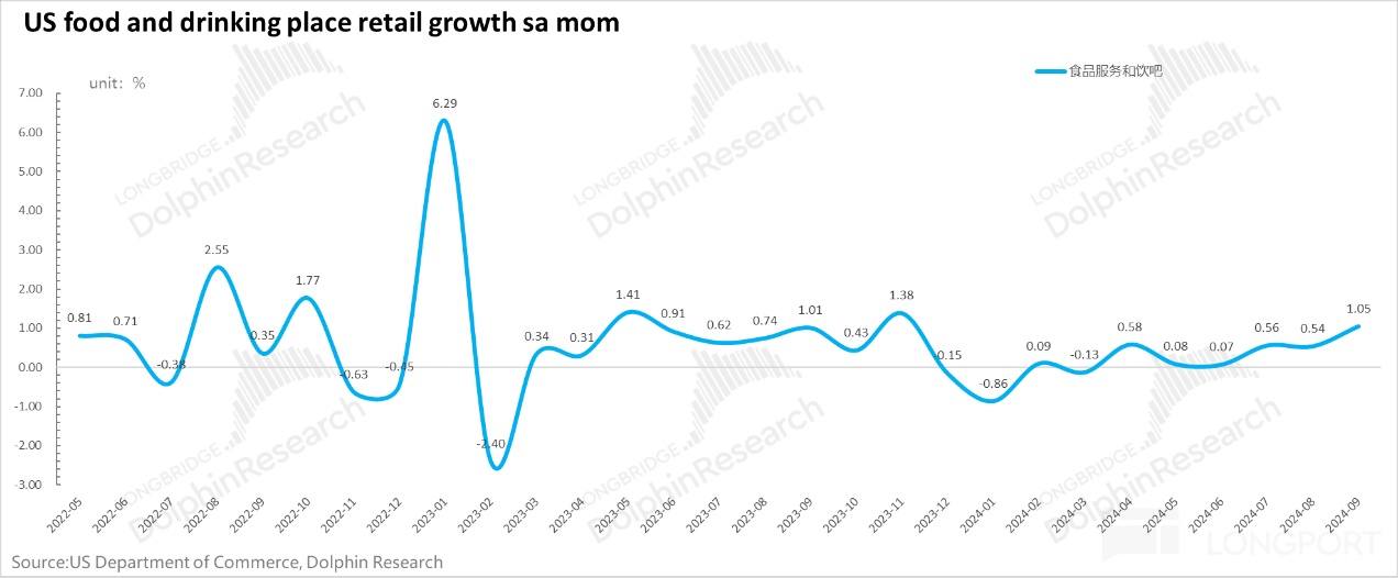 除了税收能体现出企业利润和居民收入表现不错之外,9 月美国的社会零售数据表现也比较好:季调环比是 0.43%,相当于 5.3% 的名义社零增速。而剔餐饮、机车部件、加油站和建材的核心零售增长更是从上个月的 0.3% 加速增长到了 0.7%,也就是说剔强利息敏感性的行业后,美国的社会实物零售增速其实更高。