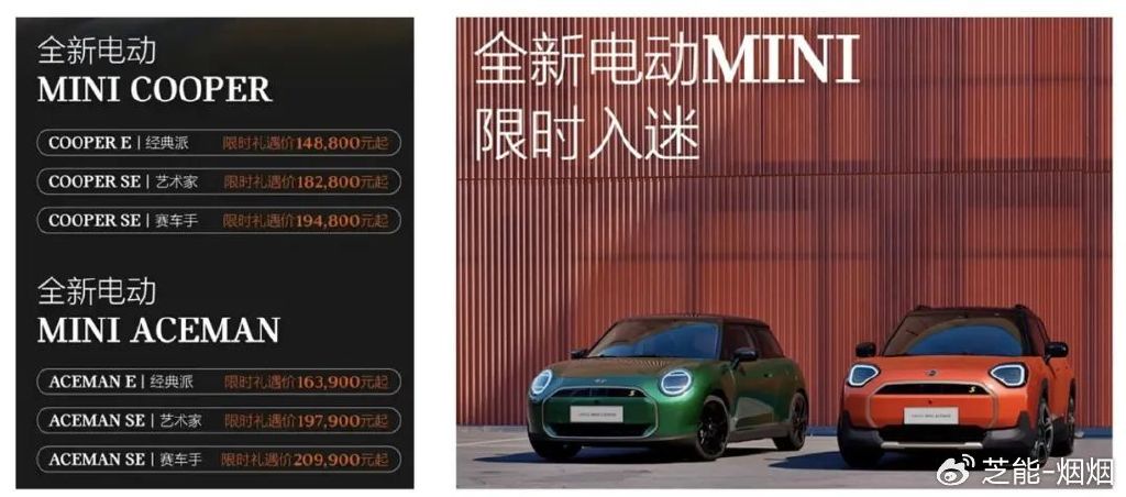 MINI 中国官方宣布,旗下全新电动 MINI COOPER 和电动 MINI ACEMAN 的售价分别下调至 14.88 万元和 16.39 万元起,相较于今年 7 月和 8 月的上市价,分别降低了 4.1 万元和 4.6 万元。
