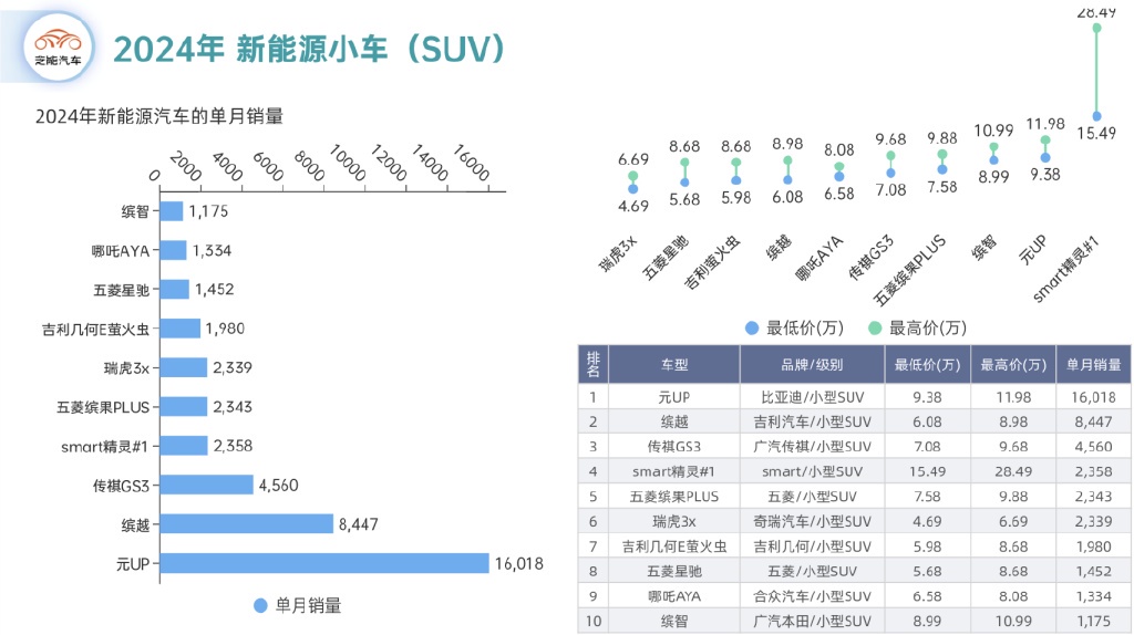 把所有的小车轿车和小型 SUV 的月度销量拉出,可以看到:比亚迪的元 Up(16018 台)、海鸥(47915 台)、海豚(15290 台)和五菱的缤果(24036 台)占据了最主要的销量名次。
