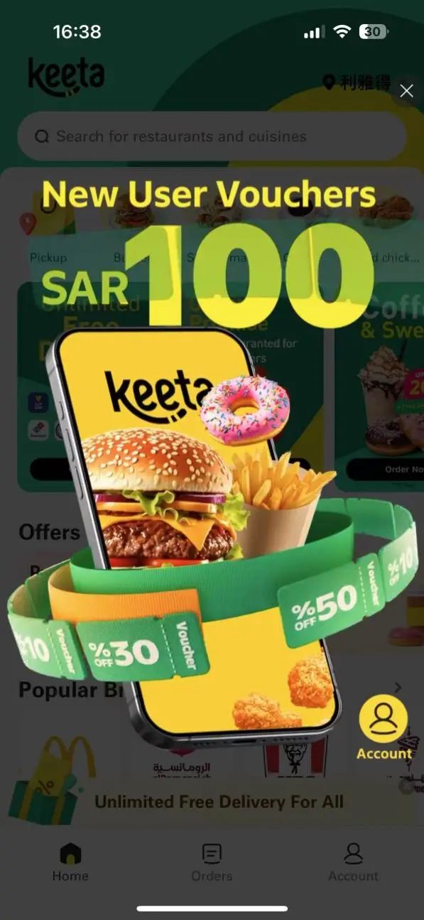 在用户端,是屡试不爽的「烧钱换市场」。点开 Keeta 沙特版的页面,100 里亚尔(约 189 人民币)的消费券映入眼帘。而更诱人的是配送费的免除,据了解,沙特外卖的平均配送费用在 15 里亚尔上下,折合人民币接近 30 元。
