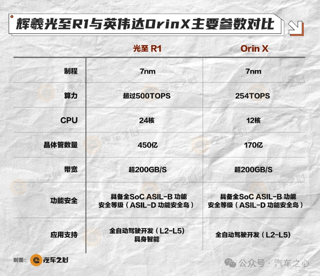由此,辉羲的光至 R1 展现出了对标英伟达 OrinX 的能力。