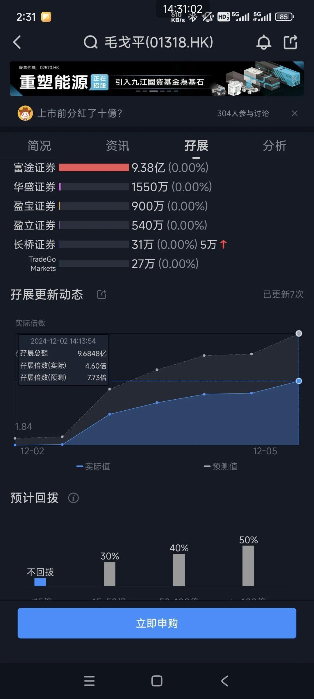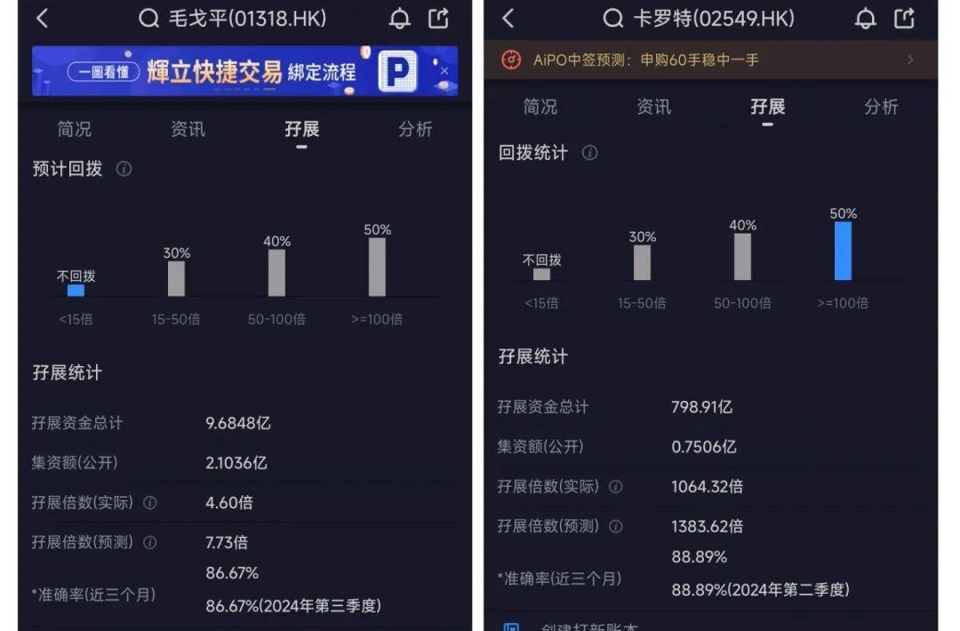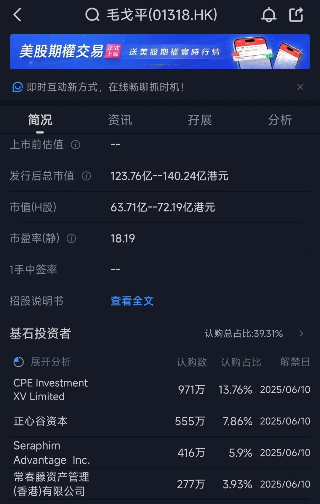 关于毛戈平中签率方面,如果孖展打爆的情况下,按照 6 万人来参与预估一下,一手中签率 50%,因为这一次募资额比较大有 22 亿,而一手认购门槛又只有 3000 非常低,所以一手中签率应该是不会太低。