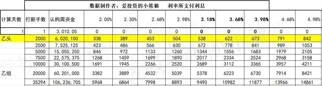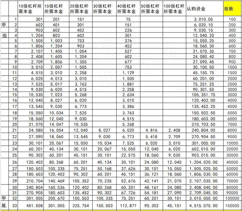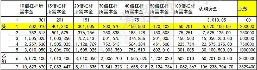 乙组头,这次是 603 万本金,基本上给 50 倍,一个账户 12 万整还参与不了乙头!乙组的各档融资所需要的本金还有融资金额对应如下表: