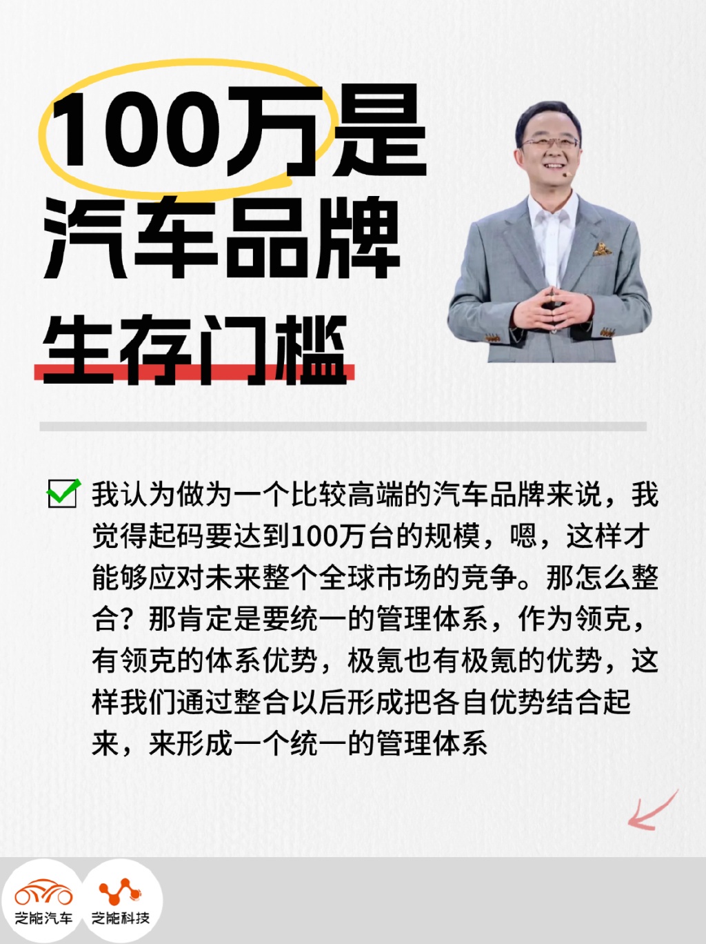 芝能关注的部分主要是涉及两块,一方面是围绕 100 万如何实现,极氪科技集团进行的品牌整合,销售和定位,通过明确的战略目标和多维度的实施路径,为在智能电动车市场的竞争中抢占先机打下了坚实基础;另一方面是智能驾驶怎么做的问题;安总都给出了明确的答案。