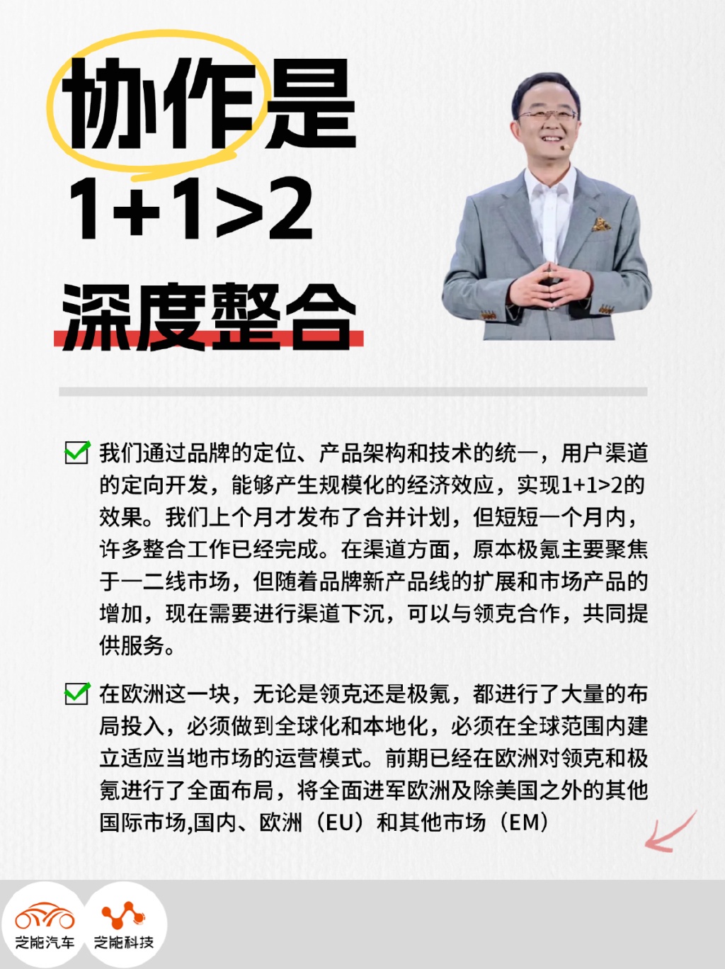 此次沟通安总主要介绍了品牌整合、市场战略、研发制造协同、产品规划布局等关键部分,以及在合并 1 个月的整合工作,聚焦于如何将领克与极氪品牌融合为有机整体,实现资源优化配置与协同发展。