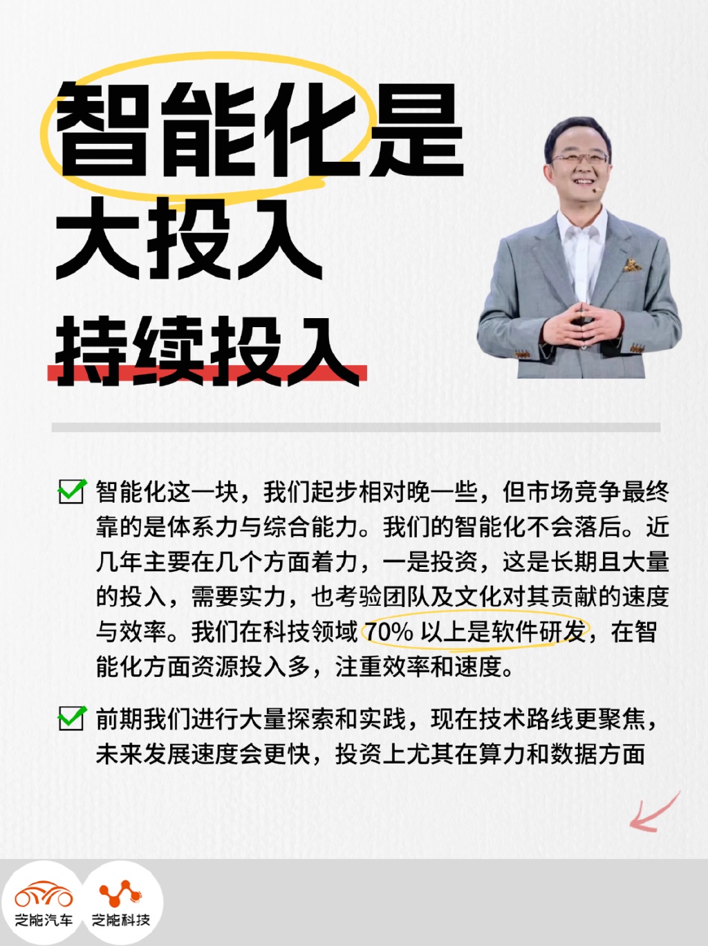 为了确保在智能化领域的竞争力不落后,正进行长期且大量的投资,这不仅需要雄厚的财力支持,还需要高效的团队和文化,以保证资源投入转化为快速的创新和发展,超过 70% 的科技资源集中在软件领域,特别是在智能化技术上。