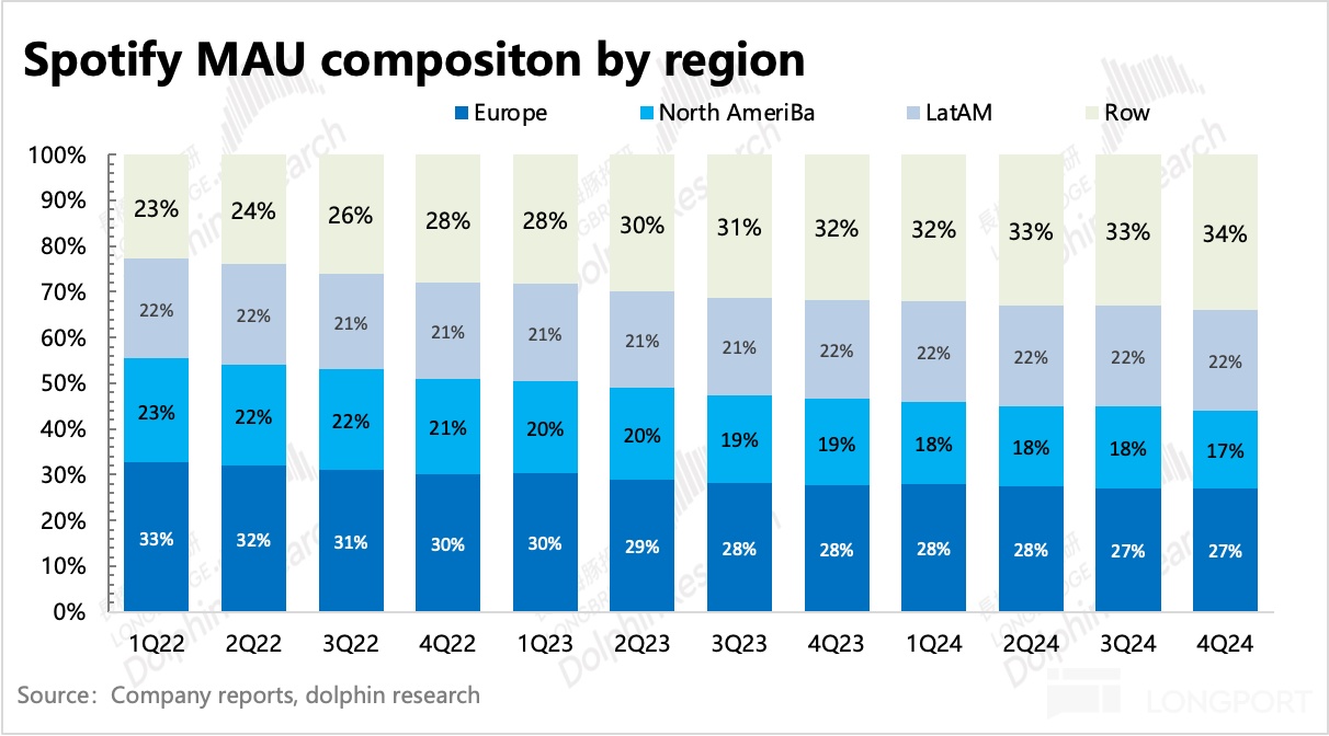 四季度 Spotify 月活 MAU 大量获客 3500 万人,显著超出前三季度表现。年底平均月活达到 6.75 亿,增量仍然主要来自于拉美和其他地区。