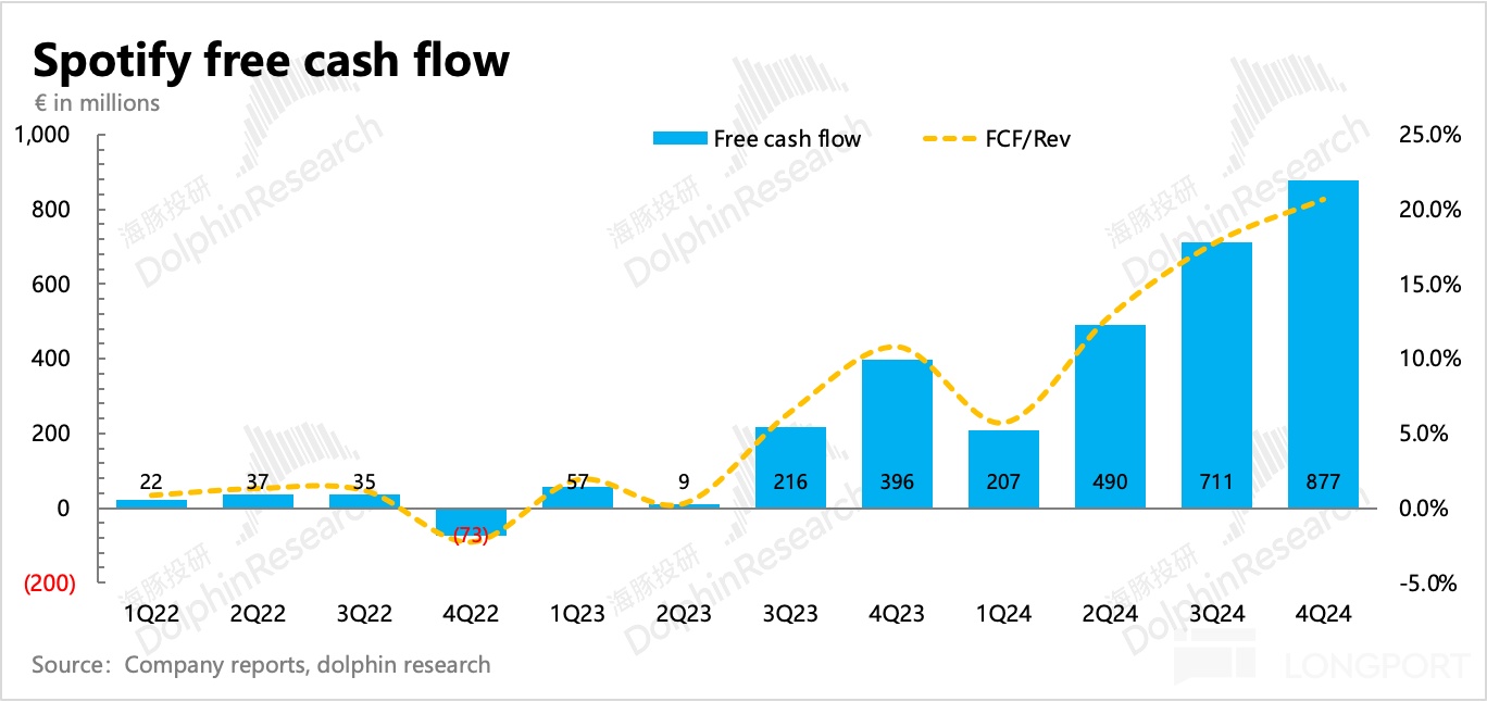 四季度 Spotify 的自由现金流进一步新高,达到 8.8 亿欧元,同比翻倍,占收入比重达到 20%,高于同期的调整后经营利润率。