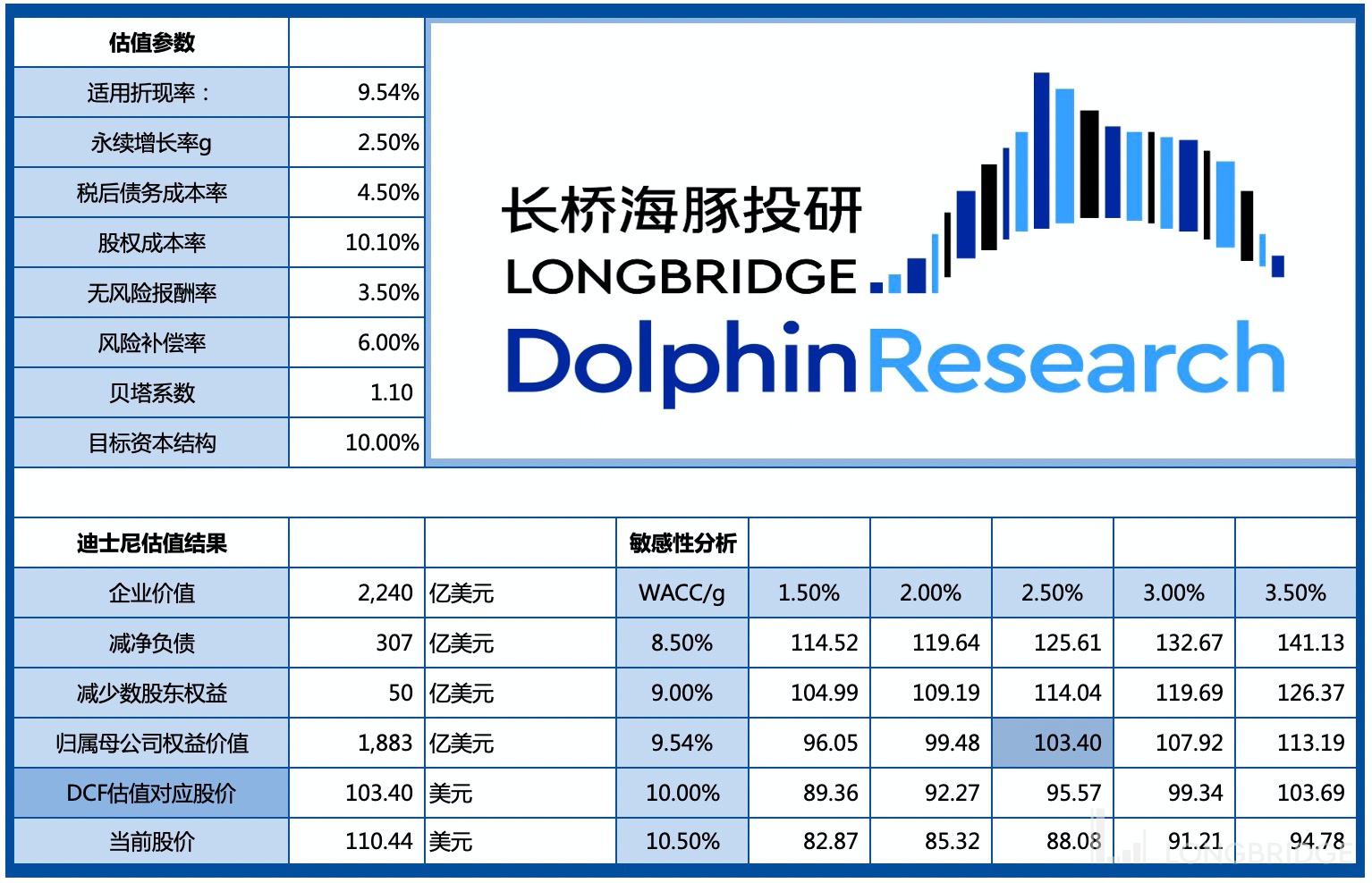 在 DCF 估值中,考虑到当下 10 年期国债上升,因此把无风险报酬率从 2.5% 提升至 3.5%。在 WACC=9.54%,g=2.5% 的假设下,最终估值为 103 美元/股。也就是说,当前的股价基本反映了中性偏保守预期下的价值。更多的溢价除了靠大盘情绪面的好转,否则就需要靠不断超预期的业绩来打消市场对通胀影响的担忧。