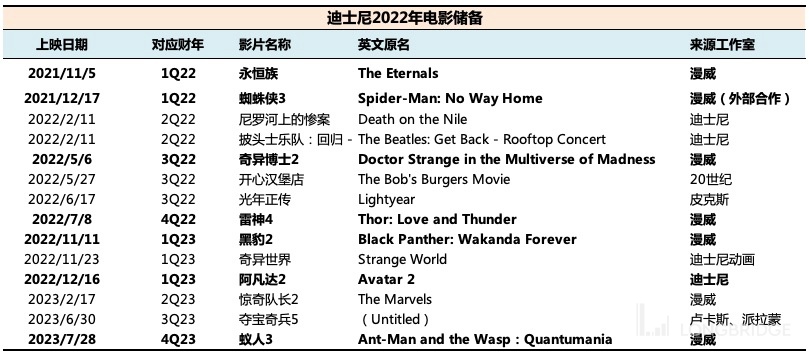 在需求高位下,迪士尼今年还将推出几部漫威大片,尤其是在 2023 财年,这是自 2019 年之后沉寂了两年的漫威新一轮产品周期,因此也有望乘着短期复苏的东风抵抗后续经济不断下行的压力。