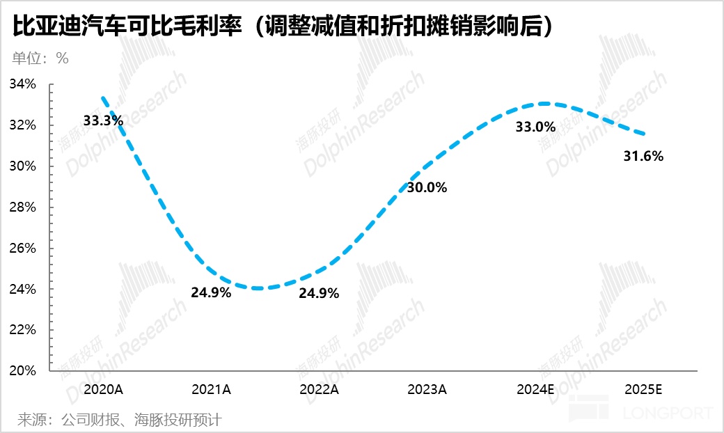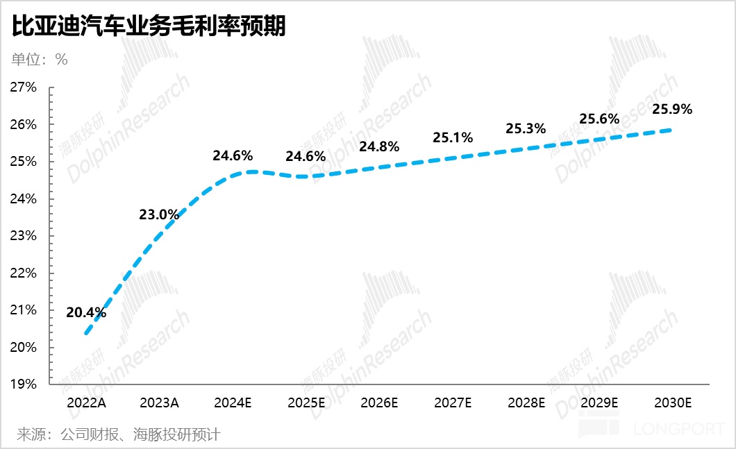 而观察 2024 年的趋势,比亚迪即使在单车收入预计下滑 1.8 万元(同比下滑 11%)的情况下,预计仍能实现了真实毛利率 3 个点上下的环比提升(调整减值,以及调回折旧摊销对于毛利率的影响后),背后仍然是垂直一体化优势和规模效应对于单车摊折的释放优势,而海豚君预计今年比亚迪同样能复刻该趋势,因此,海豚君预计,很有可能的情况是,比亚迪汽车业务毛利率很可能会与 2024 年持平,背后隐含的是: