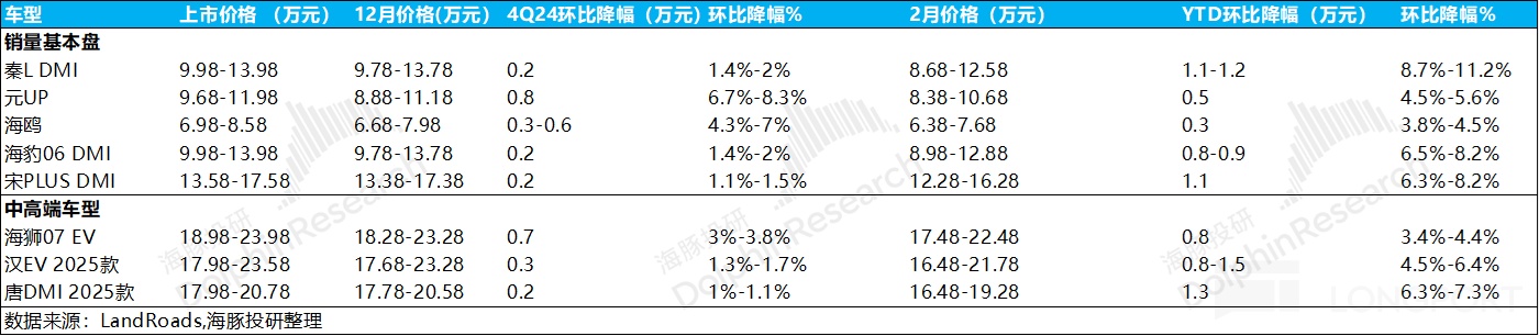 1) 25 年 Q1 业绩可能不及预期:对老款车型大幅降价促销,而智驾版车型在 2 月 10 号才上市,预计仍需要产能爬坡时间,可能对于一季度交付量贡献较小,同时根据调研比亚迪在 2025 年 1-2 月仍以清老款库存车为主,因此 2025 年一季度业绩中汽车单价和毛利率预计仍会主要受到清老款库存的负面影响,可能不及市场预期。