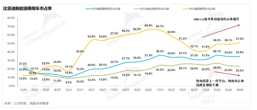 而回想一下比亚迪在 2024 年仅更新了混动的 DM 5.0 技术,纯电技术仍停留在 2022 年发布的上一代 E3.0 Evo 平台,导致纯电市占率有所下滑,在比亚迪销量结构中比重也从 2023 年 52% 下滑到 2024 年 41.5%,海豚君认为主要原因在于比亚迪新一代刀片电池的量产时间推迟(原计划在 2024 年量产和发布)。