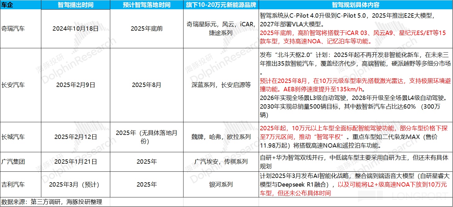 海豚君认为,比亚迪智驾入局有望掀起鲢鱼效应,尤其是在 10-20 万元价格带,促使奇瑞、吉利、长安、长城等公司在智驾上会快速跟进,拉动 10-20 万元智驾市场的供应链投资机会,终端内卷智驾渗透率的时候,上游供应链的确定性最强。