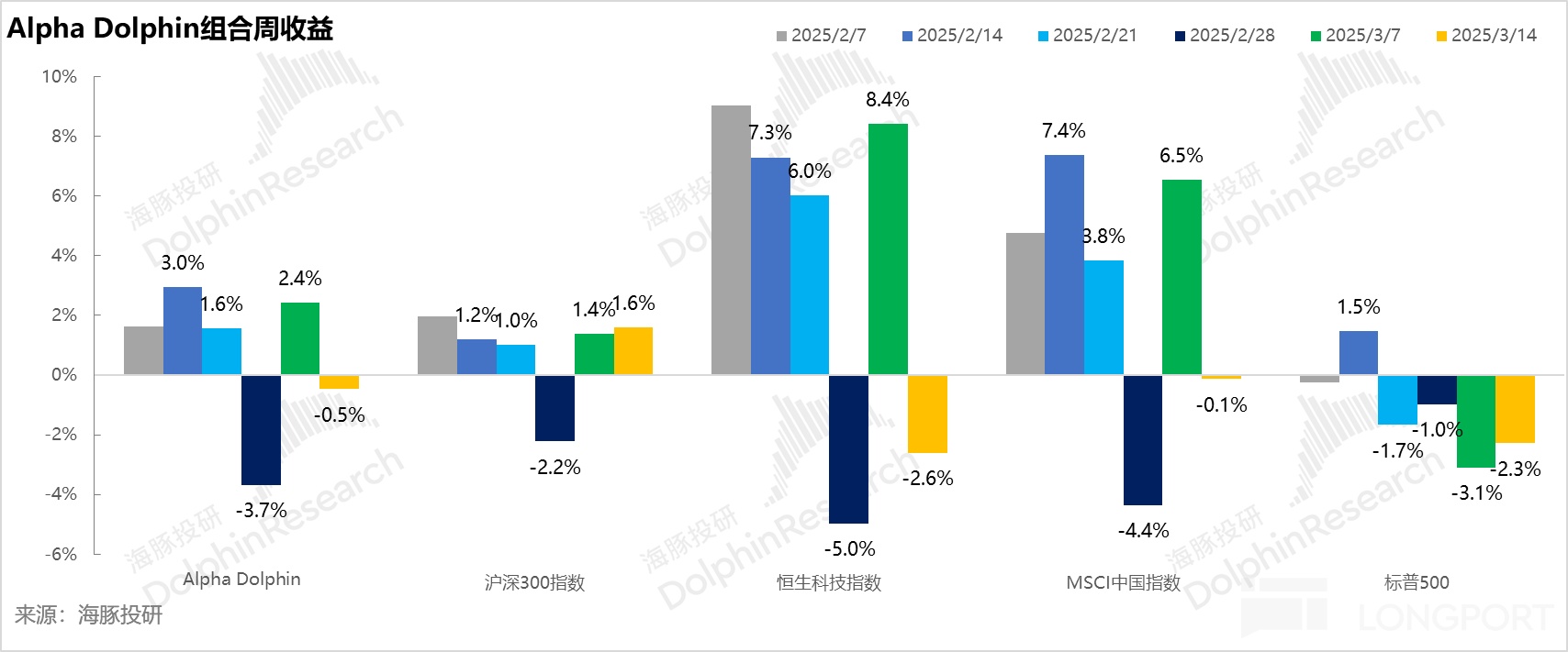 上周 Alpha Dolphin 无调仓。Alpha Dolphin 组合上周收益-0.5%,跑输沪深 300 +1.6%、MSCI 中国(-0.1%),但跑赢标普 500(-2.3%),以及恒生科技(-2.6%)。