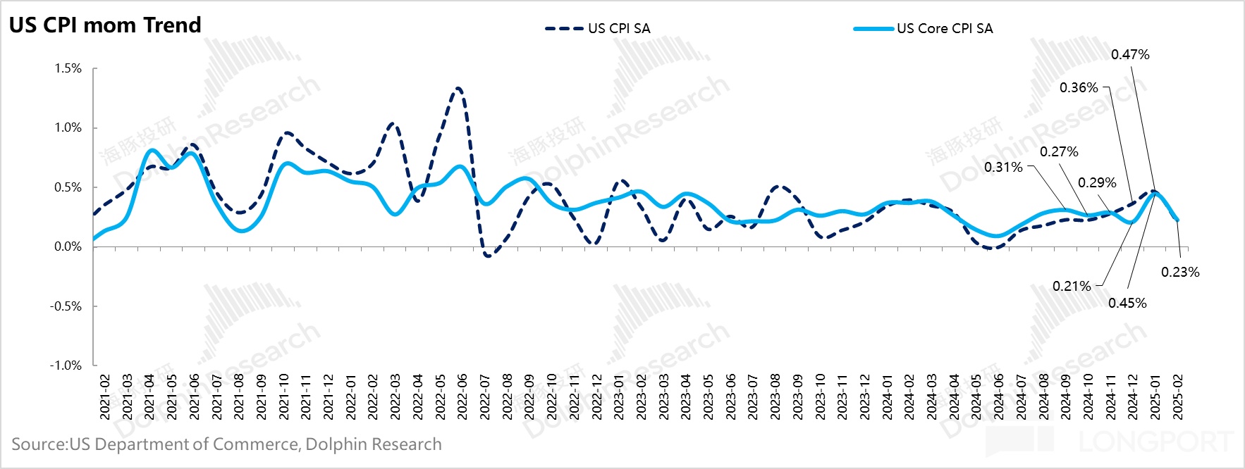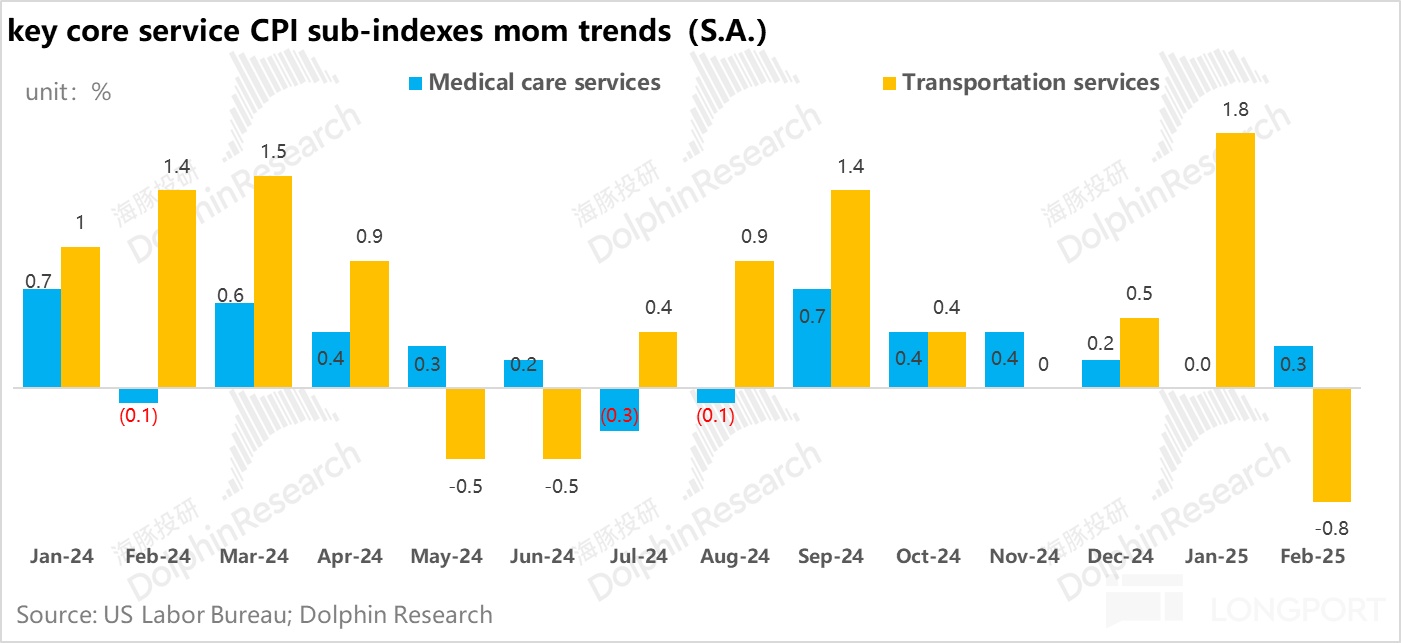 最新的 CPI 数据,基本发生在关税之前,能看到物价从高位走低,核心物价环比仅增 0.23%。能源物价稳住,核心类目,比如说核心商品中的新车和二手车,核心服务中的交通运输,物价放缓幅度均较大,尤其是运输服务直接从上个月 1.8% 的正增长,变成了 0.8% 的负增长。整体核心商品环比增 0.2%,而核心服务增 0.3%,物价明显降温。