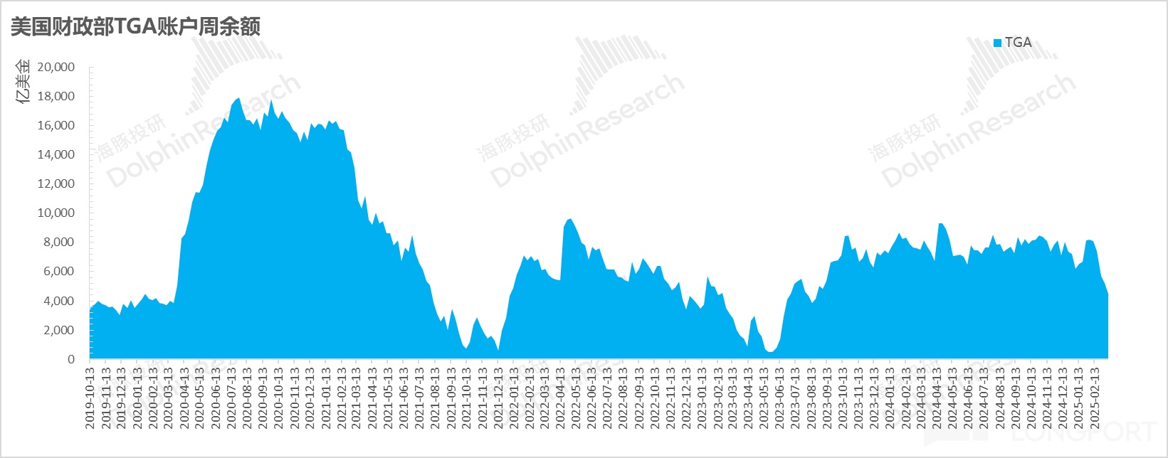 在川普的压制长债收益率的打击,目前长债仍有 4.3%。而这个收益率很显然仍然不符合共和党发长债的理想付息成本(存量国债的综合利率约为 3.5 上下%),而目前美国财政部 TGA 账户还在按周快速消耗,输血在即。