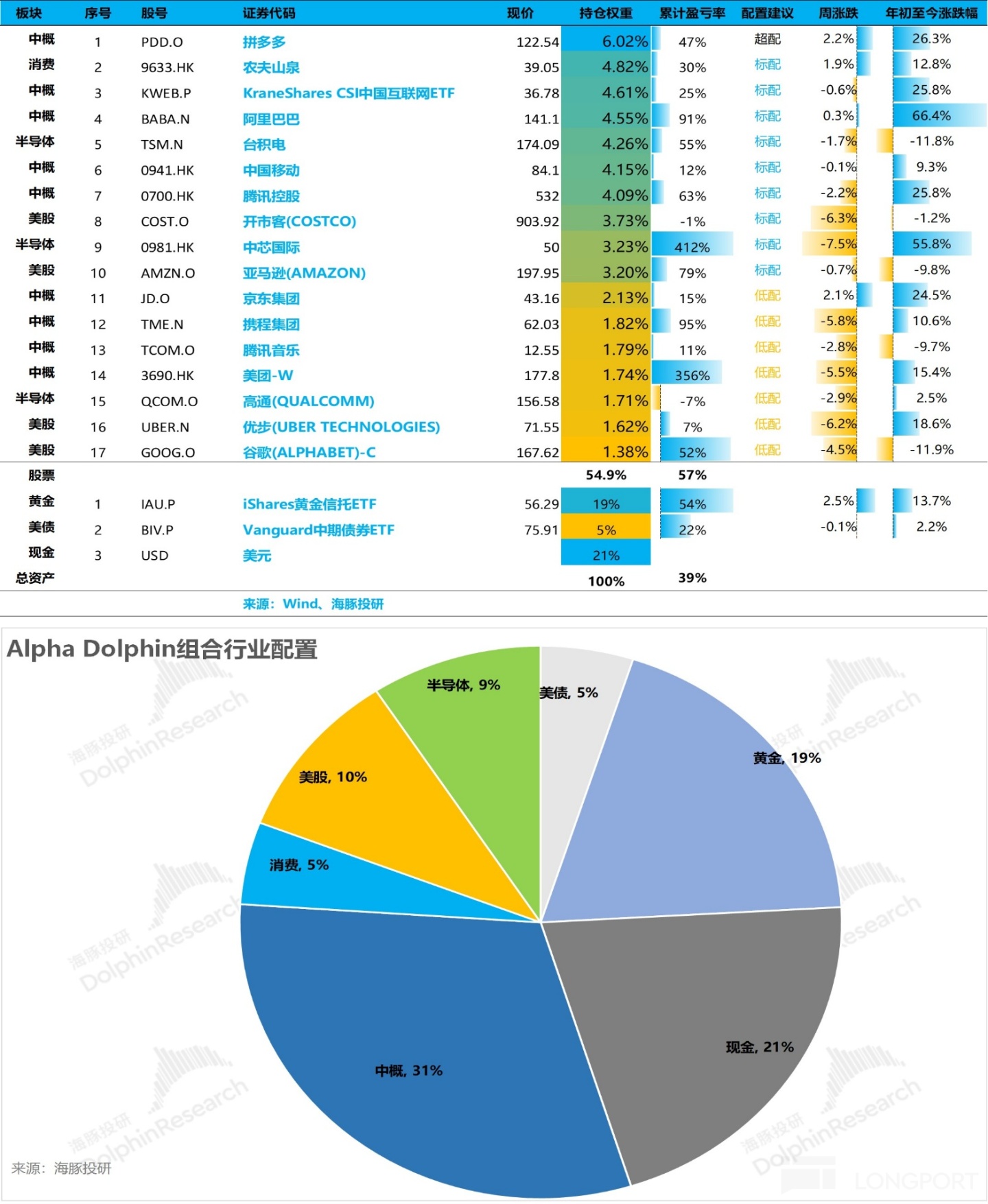 Alpha Dolphin 虚拟组合共计持仓 17 只个股与权益型 ETF,其中标配 8 只,超配 1 只,其余低配。古钱之外资产主要分布在了黄金、美债和美元现金上。