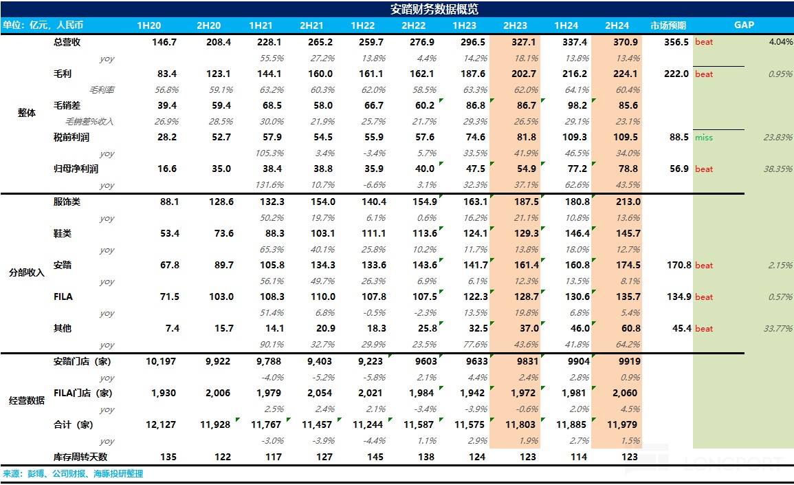(1)安踏品牌:安踏品牌收入 335.2 亿,同比增长 10.6%。2024 年推出新业态,如安踏冠军、潮流鞋子作品集、安踏旗舰店、超级安踏等,取得突破。安踏 Champion 针对高端市场,安踏 Fusion 以及超级安踏面向大众市场。新零售渠道部比如抖音在内也实现高增长。打造出如 KT7 等爆品。去年 7 月推出的 PG7 半年内销售近 200 万双。安踏儿童推出新店铺形式,安踏校园店是传统安踏儿童店的两倍,安踏儿童线上业务增长 30%,零售销售额超预期。