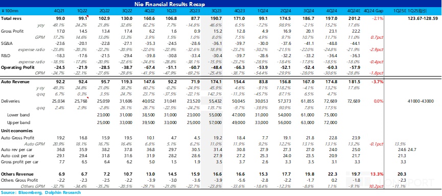 目标:2024Q4 汽车毛利率维持 13.1%,全年目标蔚来品牌毛利率 20%、ONVO 品牌 15%,并计划第四季度实现整体盈亏平衡。