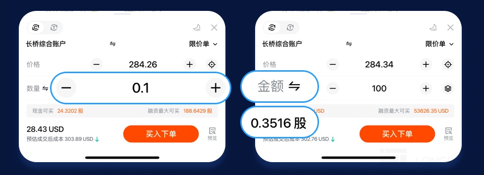 先选择支持美股碎股交易的股票,点击买入或卖出,输入数量或金额进行交易;选择输入金额时,系统将自动根据当前股价计算并转换成相应的股份数量。