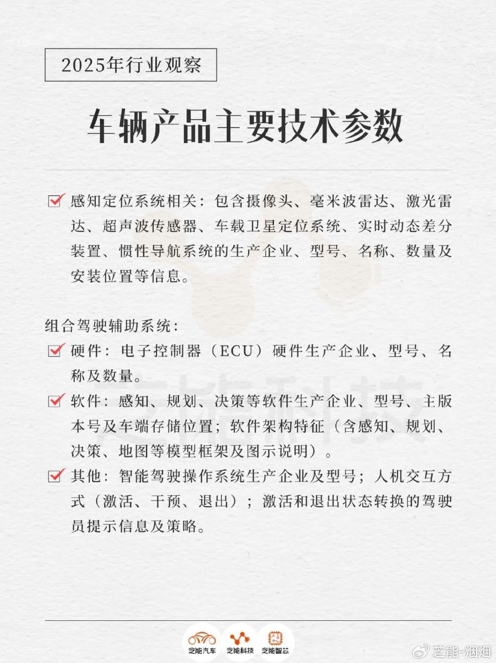 ◎ 车企需在产品主要技术参数表中补充 40 条 CDAS 和 OTA 相关参数,纳入准入和生产一致性管理,已准入产品须在 2025 年 6 月 1 日前补报;