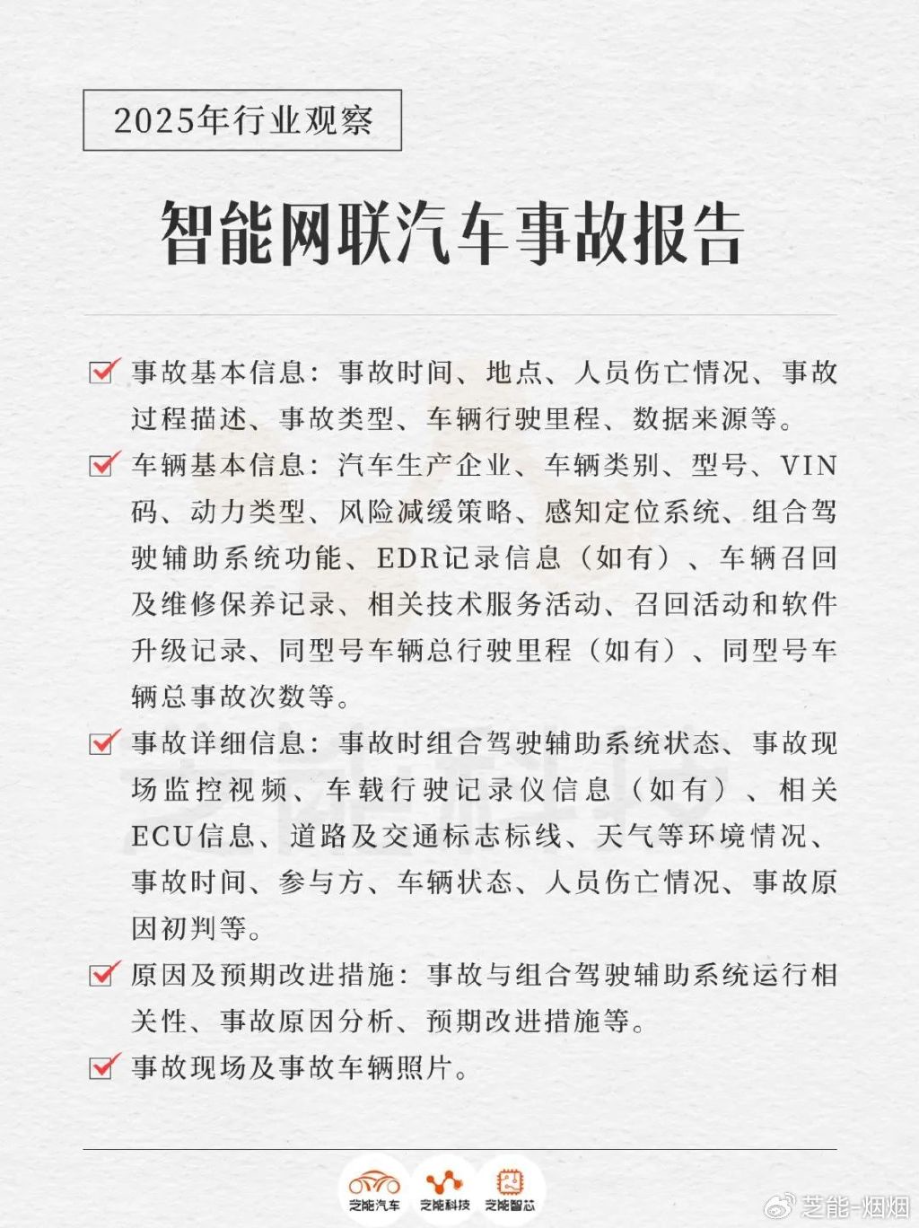 ◎ 事故报告机制要求车企在 CDAS 失效或碰撞后立即报告,包含系统状态、传感器数据和驾驶员行为等,需构建实时数据采集与分析系统。