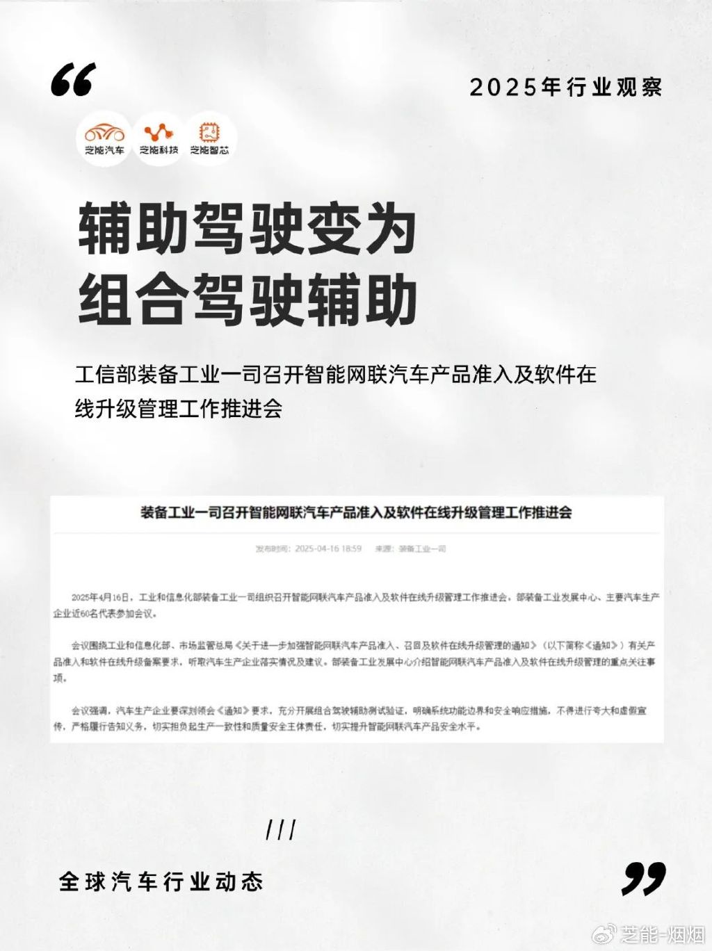 2025 年 4 月 16 日,工信部召开智能网联汽车产品准入及软件在线升级管理工作推进会,针对《工业和信息化部 市场监管总局关于进一步加强智能网联汽车产品准入、召回及软件在线升级管理的通知》(以下简称《通知》),明确了测试验证、宣传规范、OTA 管理及事故报告等强制性要求,标志着智能驾驶行业进入强监管时代。
