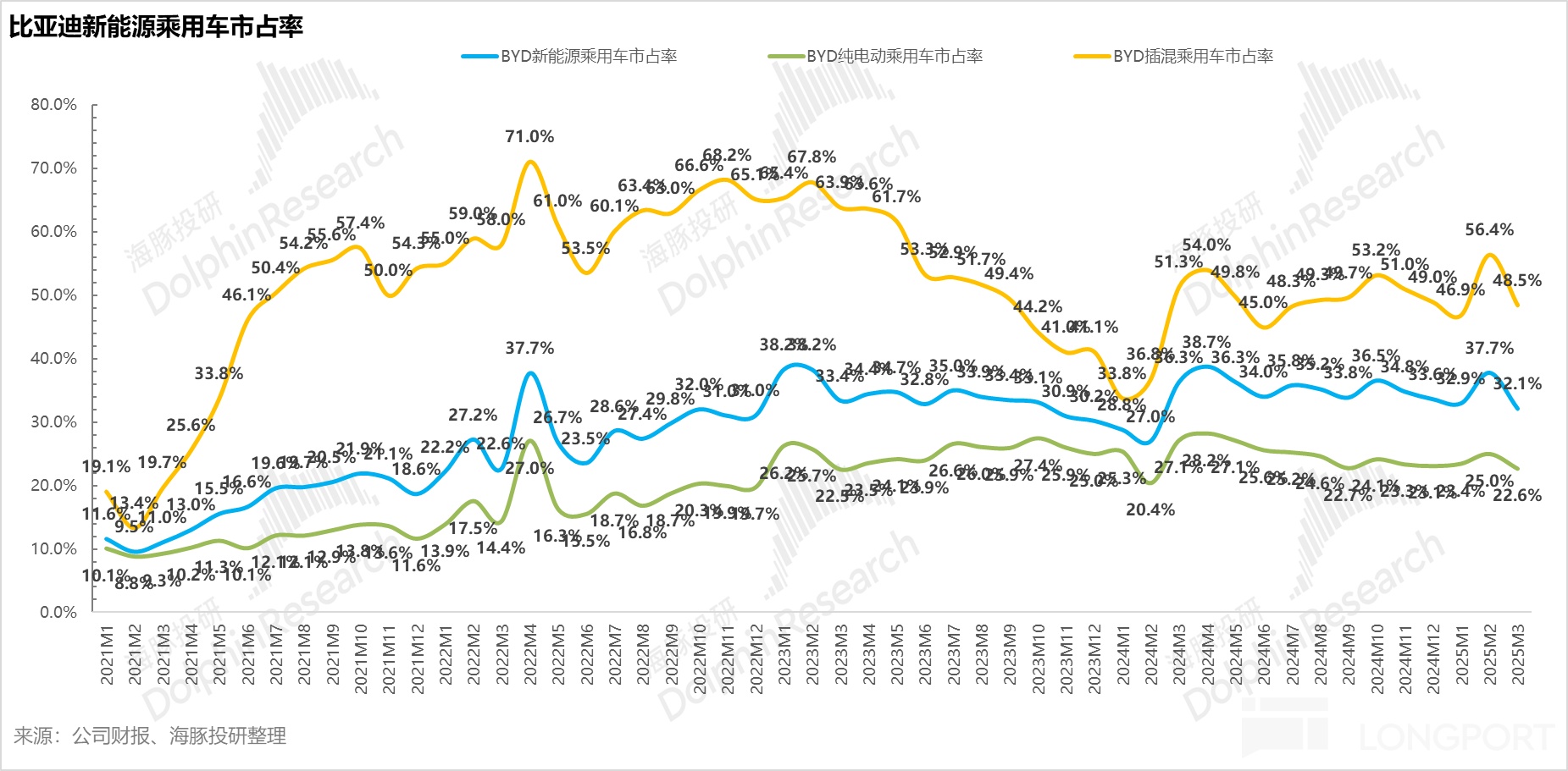 但市场仍然没有按照比亚迪今年 550 万辆销量目标指引,以及单车净利 1 万指引来对比亚迪进行充分定价(2024 年比亚迪单车净利仅 0.88 万,2025 年这个单车净利指引其实是略超海豚君的中性预期的),因为比亚迪 3 月的市占率有所下滑,以及目前高库存仍然存在清库存影响二季度单车盈利的风险,叠加 “智驾平权 “能否真的支撑今年 550 万辆看似较为激进的销量目标。
