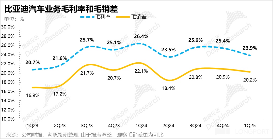 2. 卖车收入端不及预期,但在清库存周期中海豚君认为问题不大:一季度卖车收入端看似不及预期,但海豚君认为市场对比亚迪卖车收入单价预期过高,虽然一季度由于出海放量,出海销量占比达到新高,对单价端有正向的拉动作用(可能也是市场预期本季度单价还在环比上行的核心原因),但其实海豚君了解到,比亚迪一季度仍然在以清老款车库存为主,且降价幅度很大,而智驾版车型的实际上市时间较晚,所以这样的卖车单价是在海豚君意料之内的。