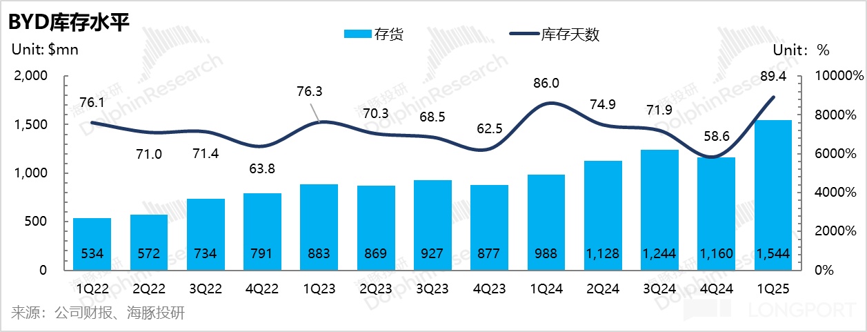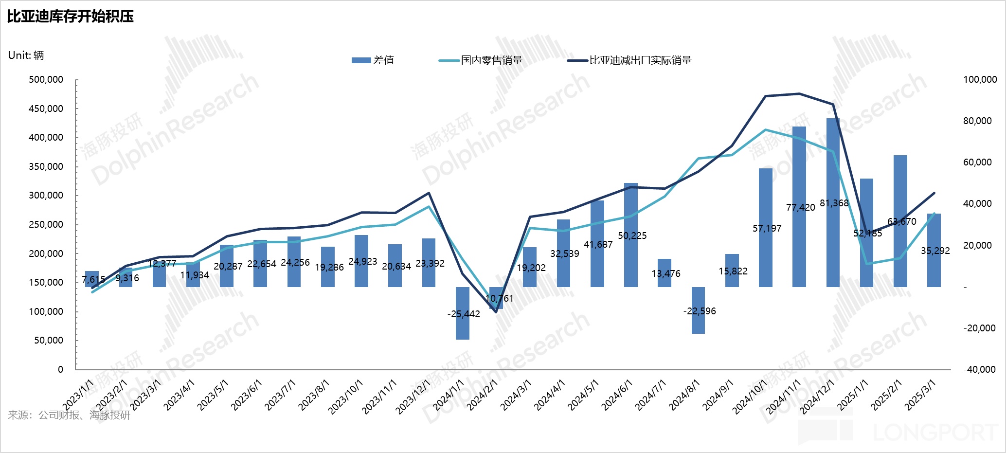 所以今年一季度,据海豚君了解下来,其实比亚迪并没有对智驾版车型的销售作为重点,反而致力于降价在清理往期的 2024 款车型的库存。而从今年一季度的库存水位来看,海豚君预计这波清老款库存可能还没有结束,可能还会持续到二季度,比亚迪可能还会继续加大对老款车型的促销力度来清库存。