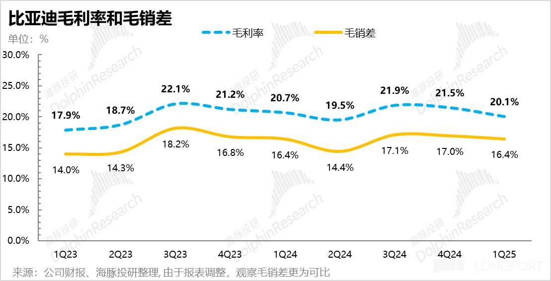 由于会计口径调整,为增强可比性,海豚君简单算了一个汽车业务的毛销差(假设整体销售费用全部归于汽车业务,因为比亚迪电子业务目前体量较小),比亚迪汽车业务即使在一季度卖车底部,规模效应很弱的情况下,仍然实现了 20%+ 的毛销差,背后仍然是强供应链溢价能力 + 高垂直整合能力 + 出海高毛利三重优势的释放。