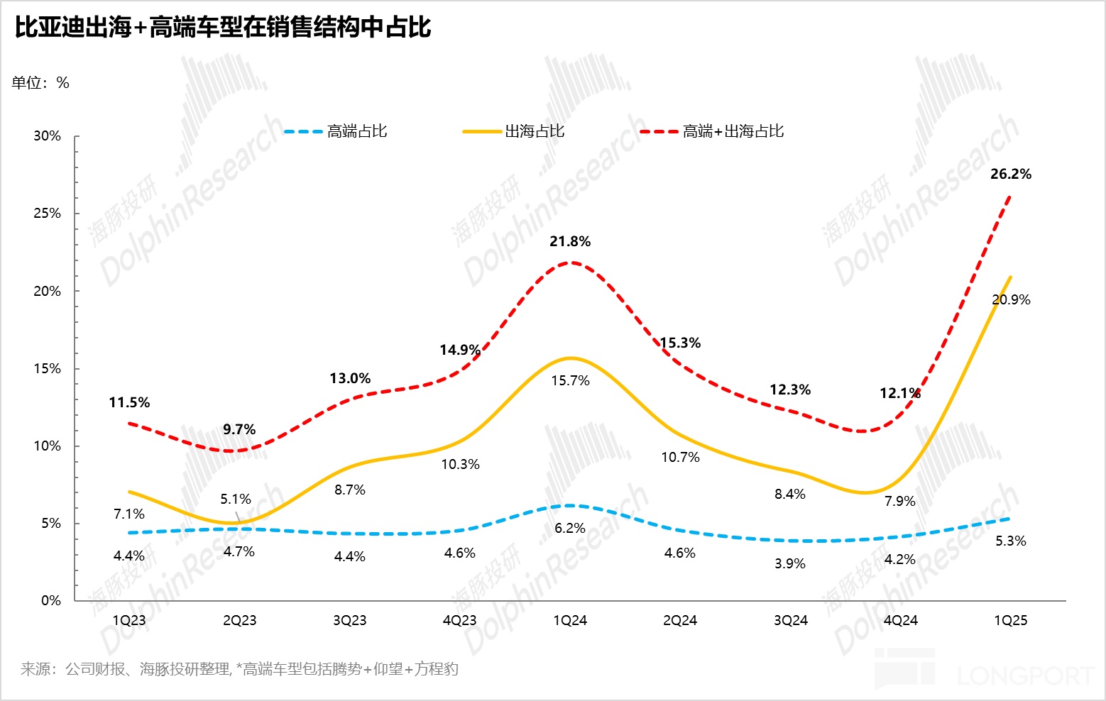 虽然初看卖车收入端低于预期,但海豚君认为市场对比亚迪卖车收入单价预期过高,虽然一季度出海在放量,出海销量占比达到新高(出海销量环比上季度几乎翻倍,在销售结构中占比提高了 13 个百分点至 20.9%),对单价端有正向的拉动作用(可能也是市场预期本季度单价还在环比上行的核心原因)。